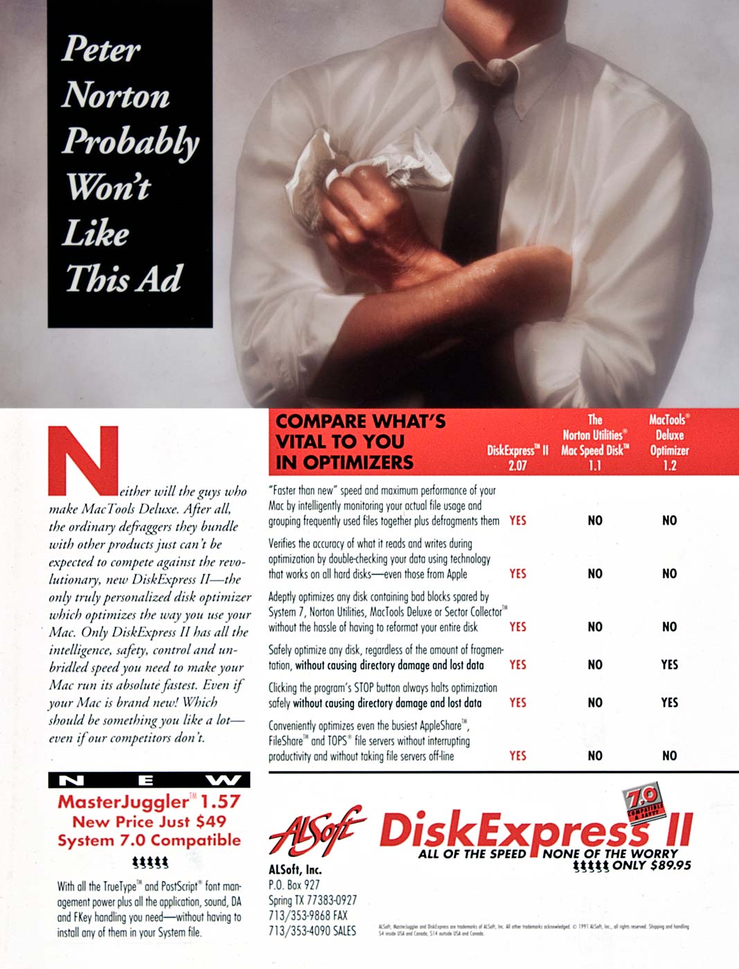 In true “gloves-off, take on the competition style,” ADS & PR did a head to head comparison of ALSoft DiskExpress II and a well-known competitor’s disk optimization product for the Mac. Because of the symbolism involved, the ad received national attention and led to strong product sales that directly boosted ALSoft's bottom line. New generations of the product continue to be released to a market of Mac users wanting to improve performance at a reasonable cost.